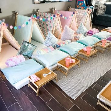 Our team at Sleepy Teepee Buford is dedicated to providing you with the best customer service possible. We love adding something unique to each party. We have complimentary sleepy eye masks(girls) and flash lights(boys) Please ensure a nice open, clean area. Set up usually takes about an hour. We offer different packages. Anything is possible- we can add custom gifts and favors to any party!